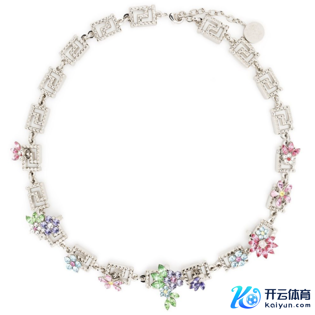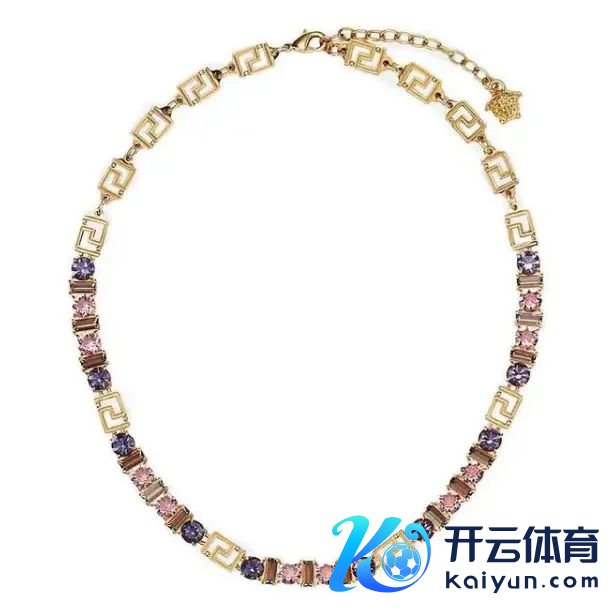 范念念哲(Versace)的希腊回纹项链由金色金属和多色水晶组成,彩色水晶和回纹图案交错摆设,独具特色。