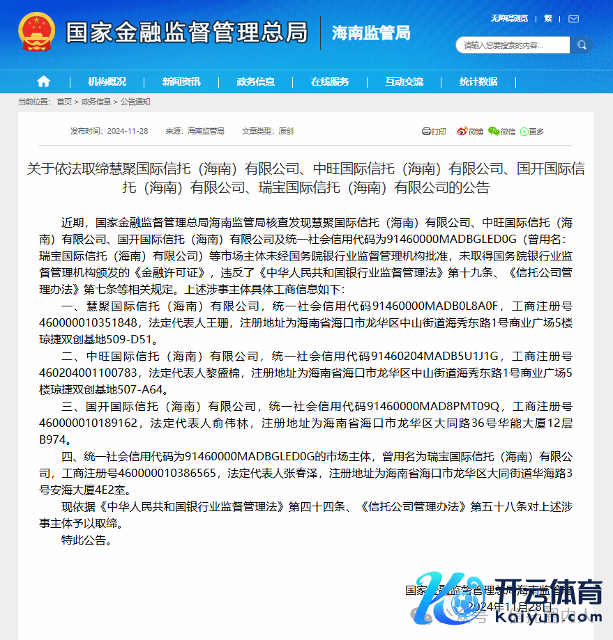 近期,国度金融监督管制总局海南监管局也照章取缔了4家包装成相信公司的违纪展业涉当事人体,相信行业合规、从严管制抓续处于高压态势。