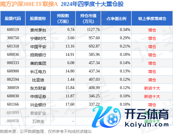 南边沪深300ETF聚拢A为指数型-股票基金,凭证最新一期基金季报涌现,该基金钞票设立:股票占净值比7.59%,债券占净值比3.17%,现款占净值比4.63%。基金十大重仓股如下: