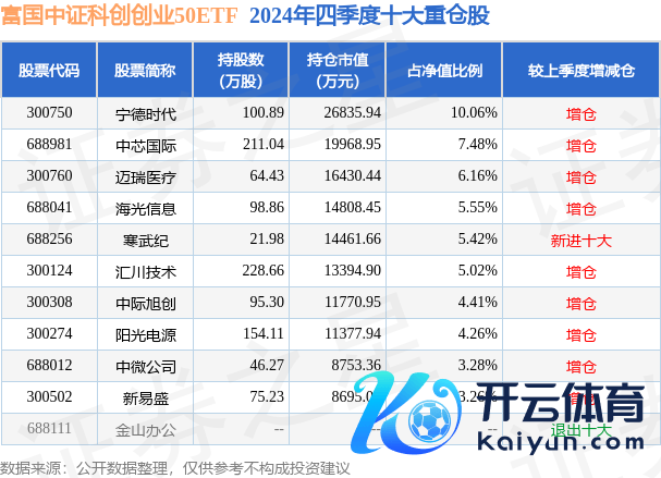 富国中证科创创业50ETF为指数型-股票基金,把柄最新一期基金季报露馅,该基金钞票建立:股票占净值比99.47%,无债券类钞票,现款占净值比0.68%。基金十大重仓股如下: